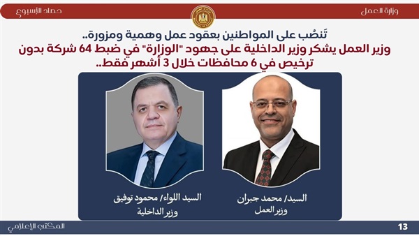 أنشطة مكثفة محليًا وعربيًا ودوليًا برئاسة الوزير محمد جبران أصدرت وزارة العمل اليوم الجمعة "انفوجراف " يوضح حصاد "الوزارة " خلال أسبوع ..حيث شهدت الوزارة احراكًا واسعًا على مختلف المستويات، ...