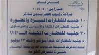 أفصحت هيئة السكة الحديد أنه سوف يتم تغليظ غرامه التذاكر لتكون 30 جنيها لراكب الدرجة الأولى و20 جنيهًا لراكب الدرجة الثانية و10 جنيهات لراكب الدرجة الثالثة و5 جنيهات لراكب قطارات الضواحى، بدءا من غد يوم الاثنين بجميع المحطات الموالية للسكة الحديد، كما سوف يتم تغليظ الغرامة المخصصة بالركوب فى غير الأماكن المعدة للركوب، مثل الركوب بين فواصل العربات أو التسطيح أو السير على القضبان؛ حرصا على أرواح المواطنين.