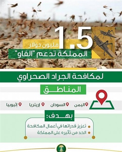 السعودية تدعم منظمة الفاو بمبلغ 1.5 مليون دولار لمكافحة الجراد الصحراوي بالدول المتضررة