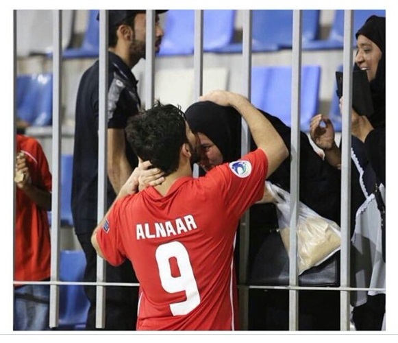 احتفل طلال النعار، مهاجم منتخب البحرين للشباب، بالهدف الثالث في شباك تايلاند، ضمن مباريات الجولة الأخيرة من الدور الأول بأمم آسيا للشباب التي تستضيفها المنامة بالتوجه ناحية والدته وتقبيل رأسها.