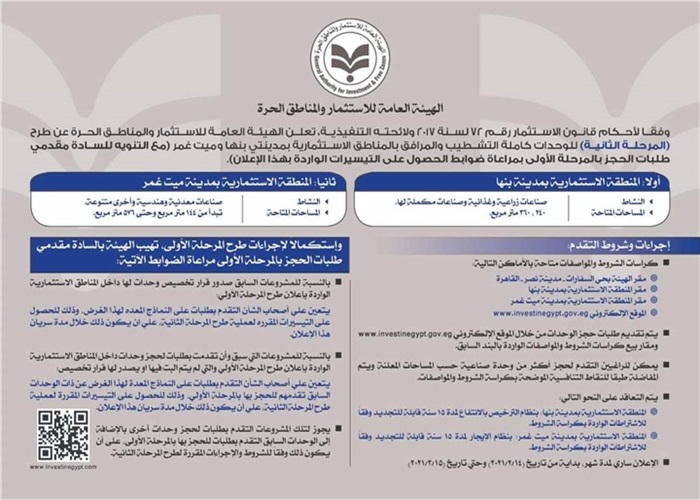 وجدير بالذكر انه يتم التعاقد بالمنطقة الاستثمارية بمدينة ميت غمر بنظام الايجار لمدة 15 سنة قابلة للتجديد وفقا للإشتراطات الواردة بكراسة الشروط،وذلك وفقا لاعلان هيئة الاستثمار.