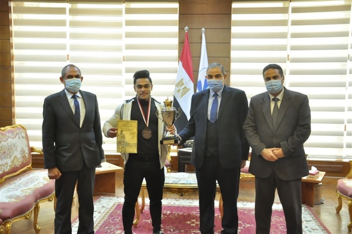 رئيس جامعة كفر الشيخ يكرم الطالب الفائز بفضية البطولة الدولية الثانية لكمال الأجسام