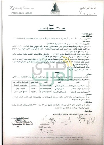 أصدر الدكتور عبد الرازق دسوقي، رئيس جامعة كفر الشيخ، اليوم الثلاثاء، القرار رقم (330) لسنة 2021، بتعيين 3 معيدين من أوائل كلية التربية الرياضية دفعة (2020/2019) وحصولهم علي درجة الامتياز مع مرتبة الشرف في مرحلة البكالوريس.