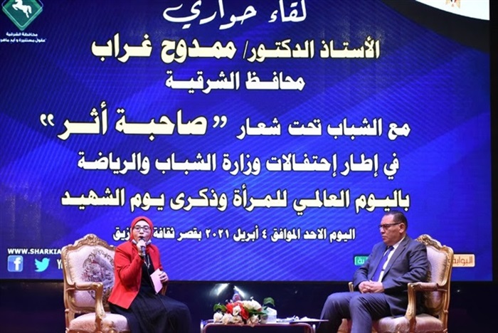 على هامش احتفالية مديرية الشباب والرياضة باليوم العالمي للمرأة وذكري يوم الشهيد والتي أقيمت بقصر ثقافة الزقازيق تحت عنوان (صاحبة أثر) ...عقد الدكتور ممدوح غراب، محافظ الشرقية لقاءاً حوارياً مع الشباب لتبادل الرؤى والمقترحات وتسليط الضوء على المشكلات والقضايا وإتاحة الفرصة لهم لعرض مبادراتهم وتفعيل دورهم في صنع القرار.