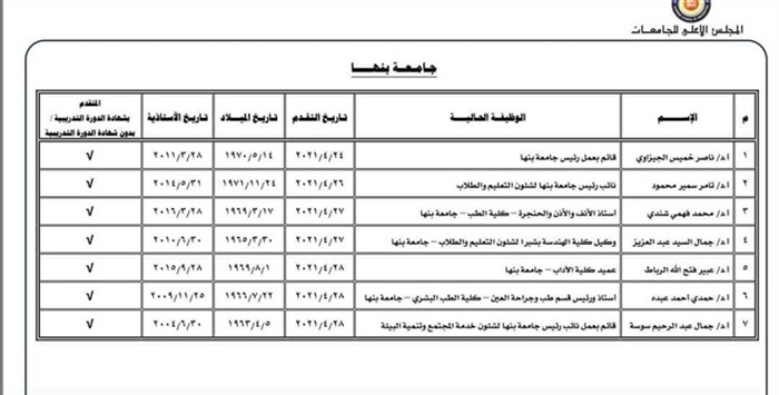 القائمة المبدئية بأسماء المرشحين لرئاسة جامعة بنها