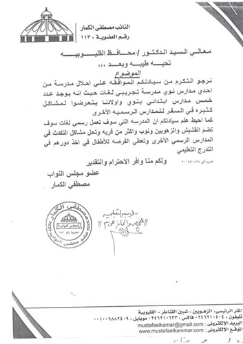 جاء ذلك بناء على الطلب المقدم من مصطفى الكمار عضو مجلس النواب السابق، عن دائرة شبين القناطر،بإنشاء مدرسة رسمية لغات بنوى.