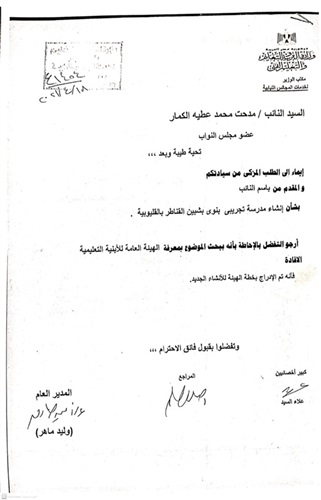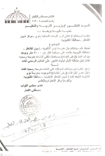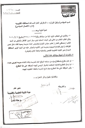 وافق اللواء عبد الحميد الهجان،محافظ القليوبية،على إنشاء مدرسة تجريبى بنوى بشبين القناطر.