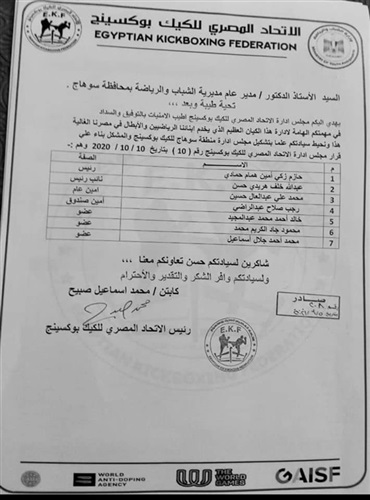 وكان الاتحاد المصري لـ الكيك بوكسينج برئاسة محمد صبيح، قد أرسل خطابًا إلى مديرية الشباب والرياضة بمحافظة سوهاج؛ يُخطرها فيه بتشكيل مجلس إدارة المنطقة لـ لعبة الكيك بوكسينج.