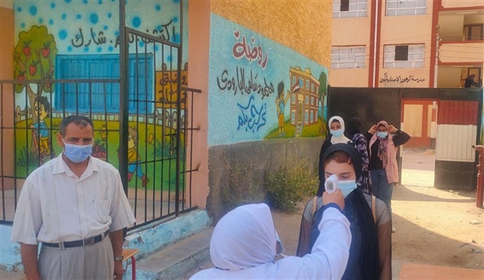 وتبلغ كثافة اللجان ١٤ طالب داخل كل لجنة ويتم تعقيم جميع مقار اللجان بصفة يومية قبل وبعد الامتحانات مع تواجد طبيب أو زائرة صحية والتنبيه على التباعد والمسافات البينية الآمنة واستخدام أجهزة الكشف الحرارى بكل لجنة وتوفير الاعداد اللازمة من الكمامات وتوزيعها على الطلاب والتأكد من عمل بوابات التعقيم يوميا والتنبيه علي الطلاب بعدم اصطحاب اى هواتف واستخدام العصا الإلكترونية يوميا للكشف عن المعادن