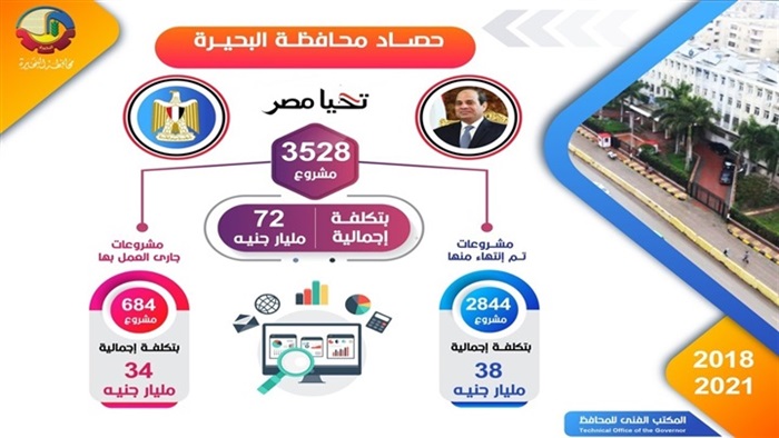 هذا وقد قام المكتب الإعلامي لمحافظ البحيرة بنشر ٱنفوجراف يسلط من خلاله الضوء على حصاد ٣ أعوام من الإنجازات حيث شهدت المحافظة تنفيذ ٣٥٢٨ مشروع في كافة المجالات والقطاعات بإجمالي تكاليف إستثمارية تبلغ ٧٢ مليار جنيه ، تم الإنتهاء من