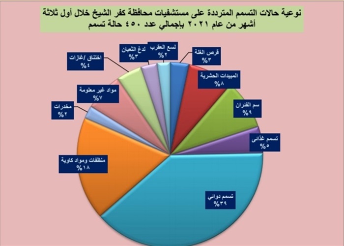 قام قسم السموم بإدارة الرعاية الحرجة والعاجلة بمديرية الصحة بكفر الشيخ، بقيادة الدكتورة انتصار نظمى، مسئول ملف السموم، بتقديم الخدمة الطبية لمصابى التسمم بجميع مستشفيات كفر الشيخ بما يتراوح 2430 حالة، وارتفاع معدل تحسن حالات التسمم إلي 87٪، وتواجه معدلات نقل الحالات خارج المحافظة إلي 2٪.