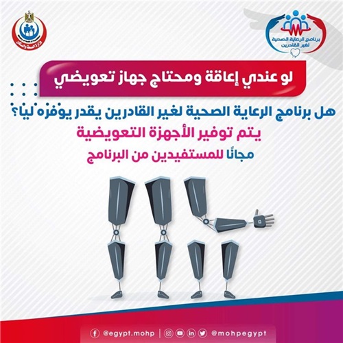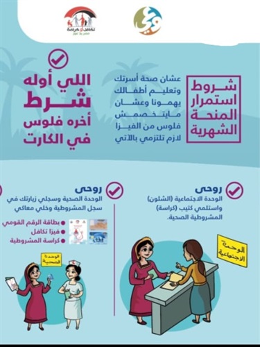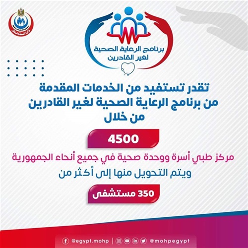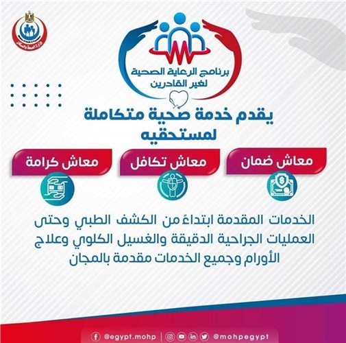وأضافت «سلام» أن برنامج رعاية غير القادرين يقدم الخدمة الطبية بالمجان لأصحاب معاش تكافل وكرامة والضمان الاجتماعى وأسرهم الغير مؤمن عليهم من الكشف والفحوصات الطبية والعمليات الجراحية والغسيل الكلوي وعلاج الأورام وزراعة الأعضاء والاطراف الصناعية، كما يقدم برنامج مشروطية التكافل الصحية، الخدمة لأصحاب معاش تكافل وأطفالهم تحت سن ٦ سنوات من رعايه الحوامل والتطعيمات ومتابعه نمو الأطفال وتنظيم الأسرة والصحة الإنجابية والحصول علي خدمة رعاية غير القادرين والمشروطية يجب التوجه لاقرب وحدة صحية.
