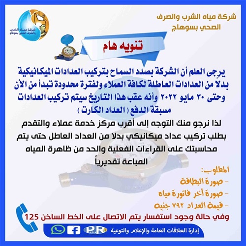 قررت شركة مياه الشرب والصرف الصحى بسوهاج فتح أبواب مراكز خدمة العملاء غدا الجمعة الموافق ٢٧ مايو ٢٠٢٢ من الرابعة عصرا حتى التاسعة مساء وذلك لتلقى طلبات العملاء اصحاب العدادات العاطلة لتغيرها بعدادات جديدة