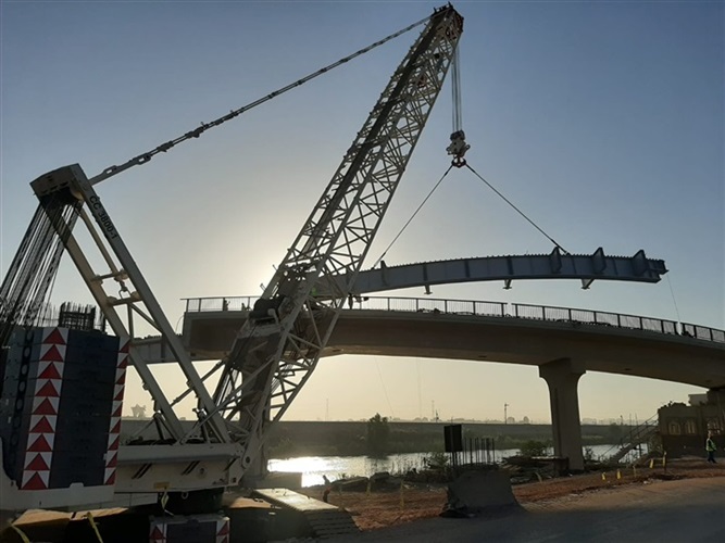 قال اللواء عصام سعد محافظ أسيوط إنه جاري تركيب الكمرات المعدنية لكوبري منقباد العلوي الجاري إنشاؤه أعلى المجرى المائي للترعة الإبراهيمية التي يبلغ عرضها 80 متر فيما يصل وزن الباكية المعدنية 190 طن ومتوسط طول الكمرات حوالي 35 متر ومتوسط وزن الكمرة الواحدة حوالي 35 طن بإستخدام مجموعة أوناش بحمولات تصل إلى 650 طن وذلك بالاشتراك بين فرع شركة المقاولون العرب بأسيوط وإدارتي ترسانة المعصرة وتأجير المعدات.