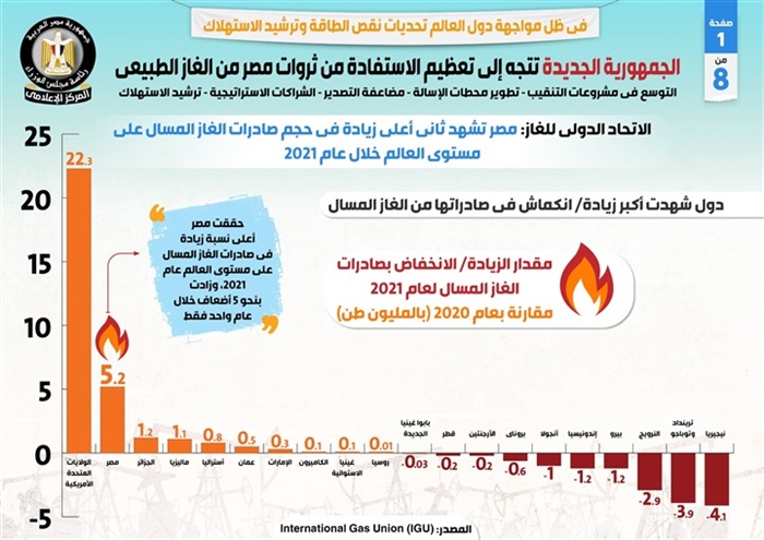 وأشار التقرير إلى ما أورده الاتحاد الدولي للغاز بأن مصر تشهد ثاني أعلى زيادة في حجم صادرات الغاز المسال على مستوى العالم بمقدار 5.2 مليون طن خلال عام2021 مقارنة بعام 2020، فيما زادت بنحو 5 أضعاف خلال عام واحد فقط لتحقق أعلى نسبة زيادة في صادرات الغاز المسال على مستوى العالم عام 2021.