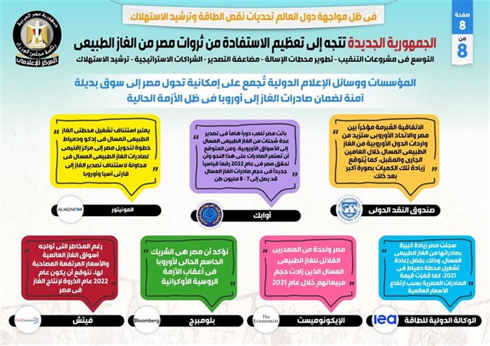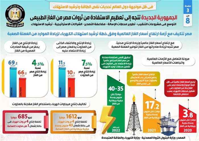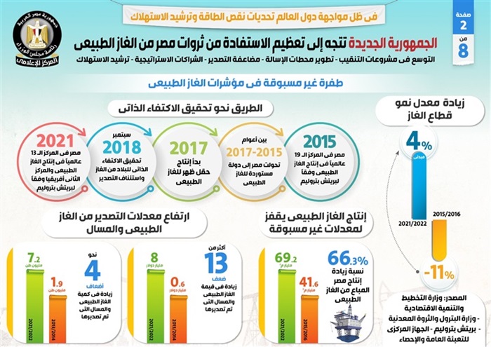 وفي هذا الصدد نشر المركز الإعلامي لمجلس الوزراء تقريراً تضمن إنفوجرافات تسلط الضوء على اتجاه الجمهورية الجديدة إلى تعظيم الاستفادة من ثروات مصر من الغاز الطبيعي، في ظل مواجهة دول العالم تحديات نقص الطاقة وترشيد الاستهلاك، والتي تشمل التوسع في مشروعات التنقيب، وتطوير محطات الإسالة، ومضاعفة التصدير، والشراكات الاستراتيجية، وترشيد الاستهلاك.