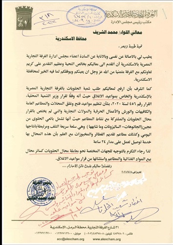 جاء ذلك ردًا على خطاب تقدم به أحمد الوكيل، رئيس الغرفة التجارية بالإسكندرية، إلى محافظ الإسكندرية، يعرض خلاله مطلب شعبة الحلويات برئاسة محمد حفني، الخاص باستثناء محلات الحلويات من مواعيد إغلاق المحلات.