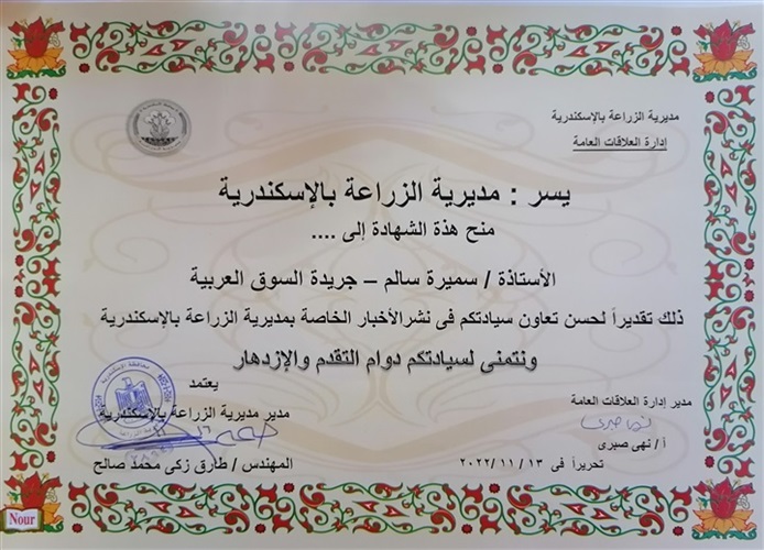 قام المهندس طارق زكي، وكيل وزارة الزراعة بالإسكندرية، بتكريم سميرة سالم، محررة السوق العربية وموقع صدى العرب، ومنحها شهادة تقدير؛ تقديرًا منه لمجهوداتها وحسن تعاونها في نشر الأخبار الخاصة بالمديرية.