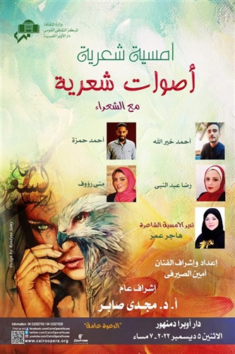 يستضيف صالون أوبرا دمنهور نخبة من الشعراء المتميزين في أمسية شعرية بعنوان " أصوات شعرية" في السابعة مساء يوم الاثنين ٥ ديسمبر، على مسرح أوبرا دمنهور ، وذلك ضمن الفعاليات الفنية والثقافية التي تنظمها دار الأوبرا المصرية برئاسة الدكتور مجدي صابر، ومن إعداد وإشراف الفنان أمين الصيرفي مدير عام النشاط الثقافي والفكري.
