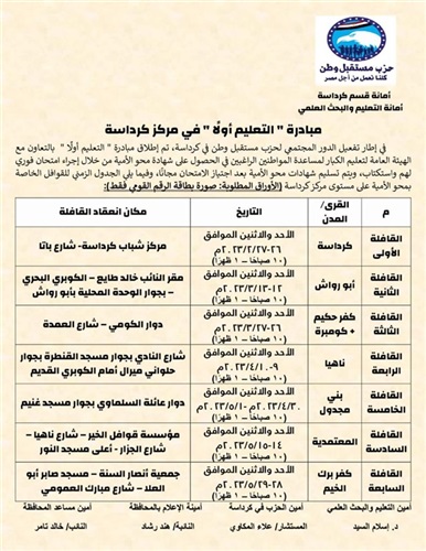 تعزيزًا للدور المجتمعي لحزب مستقبل وطن، تحت رعاية المستشار عبدالوهاب عبدالرازق رئيس الحزب، وتنفيذًا لتوجيهات النائب أشرف رشاد رئيس الهيئة البرلمانية للحزب الأمين العام والنائب الأول لرئيس الحزب، وتحت إشراف النائب علاء عابد نائب رئيس الحزب والنائبة رشا رمضان أمينة المرأة بالأمانة المركزية والنائب عادل ناصر أمين الحزب بمحافظة الجيزة والنائب عبدالوهاب خليل نائب رئيس الهيئة البرلمانية للحزب أمين التنظيم بالمحافظة، أعلنت أمانة مركز كرداسة عن إطلاق 7 قوافل لمحو الأمية بجميع قرى المركز تفعيلًا لبروتوكول التعاون مع الهيئة العامة لتعليم الكبار.