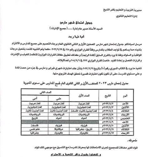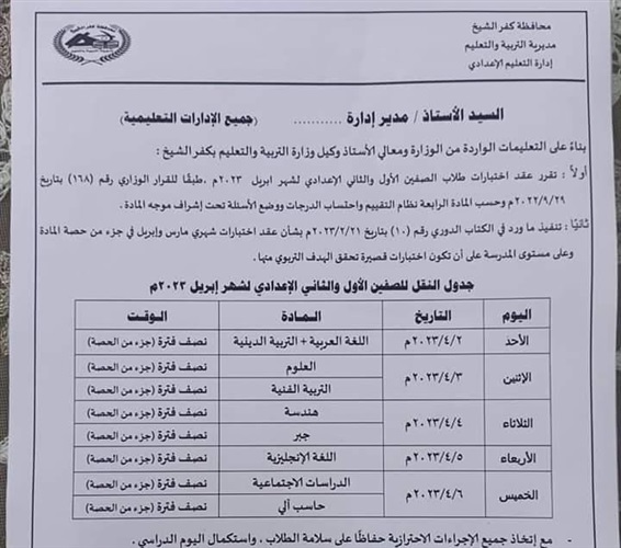 وكانت مديرية التربية والتعليم بمحافظة كفر الشيخ، أعلنت عن موعد اختبارات شهر ابريل للصفين الأول والثاني الإعدادي، للفصل الدراسي الثاني للعام الدراسي الجاري 2022 - 2023، على أن تؤدى الامتحانات أثناء اليوم الدراسي، دون الإخلال بانتظام الدراسة، أو تعطيل العملية التعليمية.