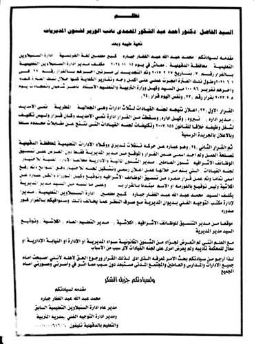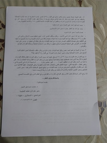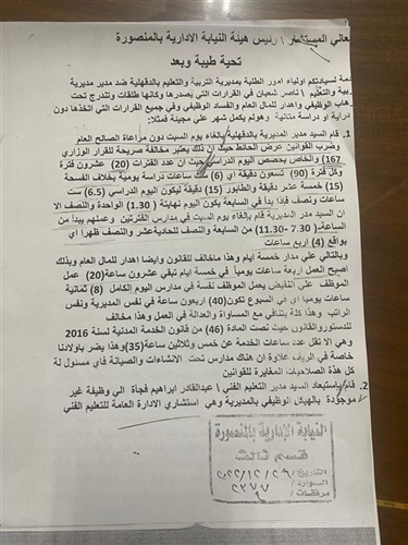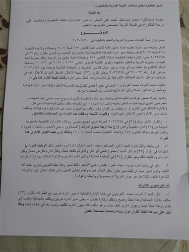 كما تقدم محمد إسماعيل النجار المدير العام السابق لإدارة طلخا التعليمية بشكوى إلى النيابة الإدارية بالمنصورة ، يشكو فيها من إهدار حقه وإحباط القيادات ذات الكفاءة ، وإصدار قرارات التعيين والندب فى خانة واحدة كدليل على سرعة وانفلات تلك القرارات التى تطيح بالصالح العام للعملية التعليمية ، ولا تستند إلى رؤية واضحة أو وازع قانونى .