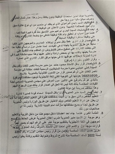 وأكد محمد عبدالله جبارة كبير معلمى اللغة الفرنسية ، والمدير العام السابق لإدارة السنبلاوين التعليمية ، أنه فوجىء بقرارين من المديرية ، الأول : شغل وظيفة خلافاً للقانون رقم 155 لسنة 2007 ، والثانى : تعمد حذف اسمه من حركة تنقلات مديرى ووكلاء الإدارة التعليمية بالدقهلية ، وتكليفه فى وظيفة أدنى في إدارة التوجيه الفنى بالمديرية ، مطالباً فى الوقت ذاته بعودة الحق لأصحابه ، جراء استبعاده دون سبب من وظيفته الأصلية .