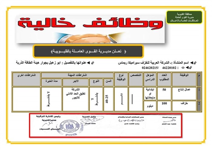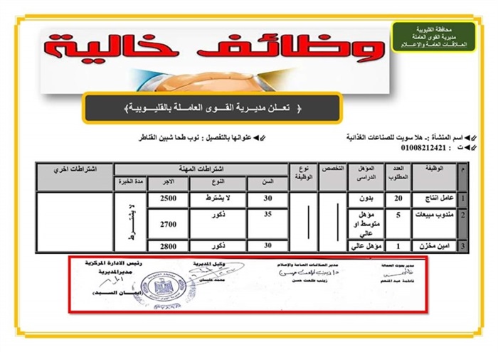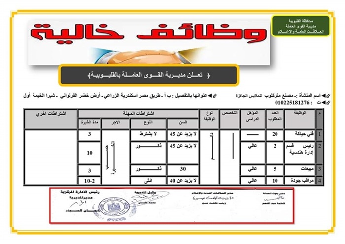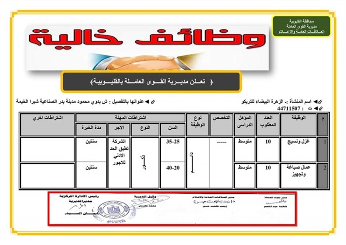 أعلنت محافظة القليوبية عن توافر وظائف جديدة بمديرية القوى العاملة بالمحافظة من خلال النشرة الشهرية للتوظيف والتي توفر 399 وظيفة في 10 شركات ومصانع بالمحافظة للراغبين في العمل بخبرة وبدون خبرة بمرتبات تبدأ من 2500 جنيه حسب الخبرة.