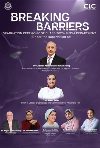 أعلنت كلية اللغة والإعلام بالإسكندرية، برئاسة الدكتورة عبير رفقي عميد وتحت رعاية الدكتور إسماعيل عبد الغفار، رئيس الأكاديمية العربية للعلوم والتكنولوجيا والنقل البحري، بدء فعاليات ماراثون مشروعات التخرج لعام 2023، بقسم الإعلام بالكلية وذلك يوم الخميس المقبل 22 يونيو تحت شعار «كسر الحواجز».