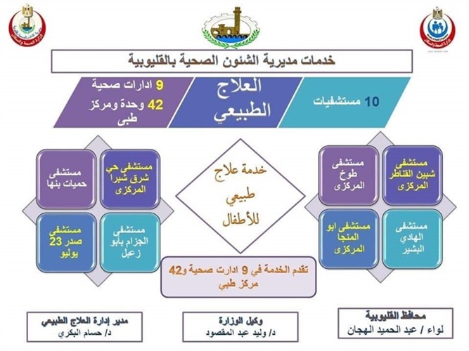 أعلنت مديرية الشئون الصحية بالقليوبية، عن توفير خدمة العلاج الطبيعي للأطفال، حيث يتمكن المواطنون من تلقي خدمات العلاج الطبيعي للأطفال بـ 8 مستشفيات على مستوى المحافظة وهي مستشفي شبين القناطر المركزي مستشفى طوخ المركزي، مستشفي الهادي البشير، مستشفى أبو المنجا المركزي، مستشفى حي شبرا شرق المركزي، مستشفى حميات بنها، مستشفى الجذام بأبو زعبل، مستشفي صدر 23 يوليو.