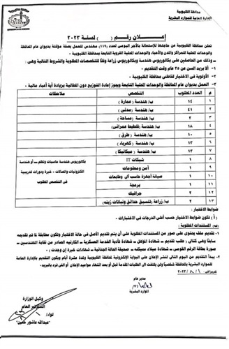 ويشترط في المتقدم أن يكون حاصل علي بكالوريوس هندسة حسابات ونظم او هندسة الكترونيات واتصالات بالاضافة الى خبرة ودورة تدريبيبة فى التخصصات الاتية 1 شبكات IT، و 1 امن ومعلومات، و1 صيانة اجهزة حاسب الي وطابعات، و1 برمجة،و 2 جرافيك، و2 بكالوريوس زراعة (تنسيق حدائق ونباتات زينة).