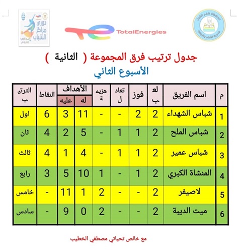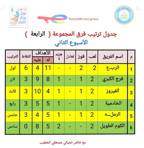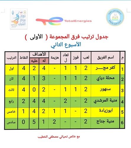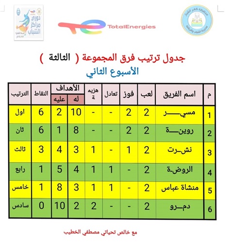 أوضح الدكتور عزت محروس وكيل وزارة الشباب والرياضة بكفر الشيخ، أن فريق "كفر مجر" تصدر المجموعة الأولى برصيد 4 نقاط وفريق "شباس الشهداء" تصدر المجموعة الثانية برصيد 6 نقاط و كذلك فريق "مسير" تصدر المجموعة الثالثة ب 6 نقاط و تصدر فريق "الربع" المجموعة الرابعة وتعقد لجنة المسابقات إجتماعاً لمناقشة كافة الأحداث في مباريات الأربع مجموعات وتستعرض تقارير مراقبى المباريات لإصدار القرارات الواجبة، وفق اللوائح والقوانين للعبة كرة القدم المعمول بها في الإتحاد المصري للعبة و نشرة وزارة الشباب والرياضة .