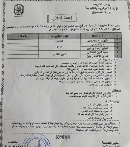 وبحسب بيان منطقة القليوبية تتضمن الأماكن الشاغرة لوظيفة شيخ معهد أزهري بعدد من معاهد المنطقة، كالتالي: