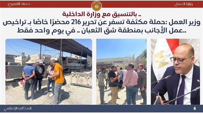 حصاد وزارة العمل في 7 أيام حملات التفتيش تُسفر عن تحرير 6185 محضرًا خاصًا بتراخيص عمل الأجانب خلال 22 يومًا فقط