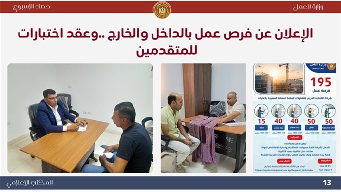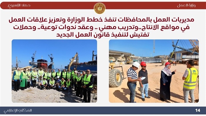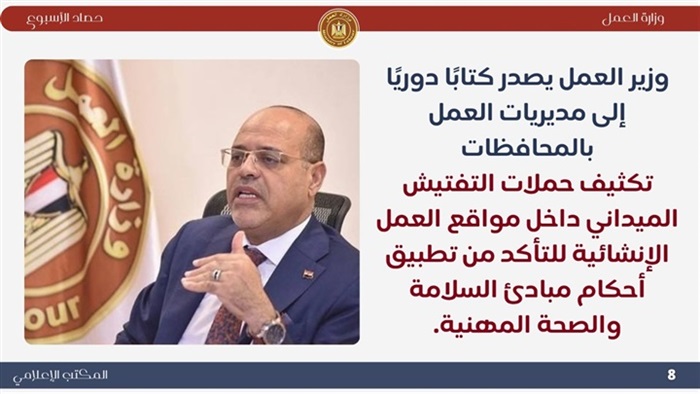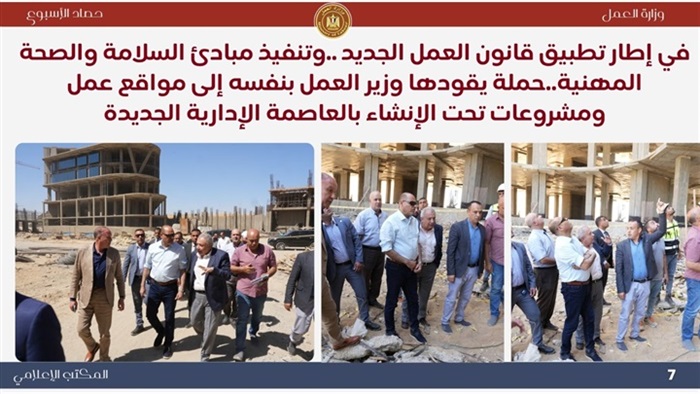 ..وخلال الأسبوع أكد وزير العمل ،على أهمية الدور الذي تقوم به "الوزارة" و"المديريات" والإدارات المُختصة بكافة ملفات العمل ، موضحًا أن التطوير المُستمر، والتنسيق والتعاون، والتقييم الدوري والمنتظم ، يُحقق المزيد من النجاحات ، وتقديم الخدمات للمواطنين بشكل لائق وكريم ، تنفيذًا لتكليفات فخامة الرئيس عبدالفتاح السيسي ..جاء ذلك خلال إجتماع عقده الوزير جبران ،بمقر "الوزارة" بالعاصمة الإدارية الجديدة ،مع السادة وكلاء الوزراة ،رؤساء الإدارات المركزية ، ومديري الإدارات ، موجهًا بتنظيم إجتماع دوري كل شهر للتواصل المباشر بين كافة الإدارات لمواجهة التحديات التي قد تواجههم أثناء تأدية عملهم..كما شهد وزير العمل ،من مكتبه بالعاصمة الإدارية الجديدة ،عن طريق "الفيديو كونفرانس "،وفي وقت واحد ، فعاليات تسليم عقود عمل ، نظمتها مديريات العمل في 26 محافظة ، وذلك بتوفير أكثر من 700 فرصة عمل في شركات القطاع الخاص ، معظمهم "ذوي همم"..ووجه الوزير السادة مديري المديريات بمتابعة تنفيذ "العقود" التي جرى تسليمها ، والتأكد من تطبيق شروط العمل ،خاصة الحد الأدنى للأجور،وكذلك بالتعاون والتنسيق المستمر مع القطاع الخاص في هذا الشأن .. كما وجه الوزير بتكثيف الجهود لتعزيز علاقات العمل بين طرفي العملية الإنتاجية من أصحاب الأعمال والعمال ،والاستمرار في حملات التفتيش المكثفة لتطبيق قانون العمل الجديد رقم 14 لسنة 2025، خاصة تراخيص عمل الأجانب، والتأكد من صحة "عقود العمل" ،وتطبيق الحد الأدنى للأجور ..وقام وزير العمل، بقيادة حملة إلى عدد من مواقع العمل داخل العاصمة الإدارية الجديدة ، وذلك في إطار حملات تفتيشية تقوم بها الإدارة المركزية للسلامة والصحة المهنية في جميع المحافظات ، لمتابعة إلتزام المنشأت بمعايير السلامة والصحة المهنية داخل بعض المشاريع ،والتأكد من إستخدام "مهمات الوقاية" ، بهدف سلامة أدوات الإنتاج ، وصحة العمال.. ووجه الوزير ،خلال الحملة ، بايقاف العمل في بعض المنشأت ،التي ثَبُتّ عدم إلتزامها ، وذلك لحين تطبيق مبادئ "السلامة المهنية" ،وكذلك تنظيم ندوات تثقيفية للعاملين فيها للتوعية ،في إطار خطة الوزارة بالحفاظ على أرواح العمال .. وأوضح الوزير أن حملات التفتيش تستمر في كافة المحافظات ،لتطبيق قانون العمل الجديد رقم 14 لسنة 2025 ، لتوفير بيئة عمل لائقة في كافة المجالات ..