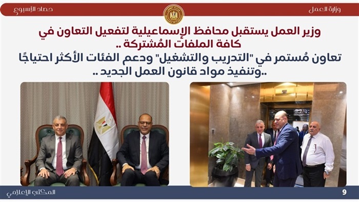 وخلال الأسبوع أصدر وزير العمل "الكتاب الدوري" رقم 18 لسنة 2025، وجه خلاله مديريات العمل بالمحافظات بتكثيف حملات التفتيش الميداني للتأكد من تطبيق أحكام مبادئ السلامة والصحة المهنية وتأمين بيئة العمل في كافة مواقع العمل الإنشائية، مع موافاة الإدارة المركزية المختصة بالنتيجة، وذلك بصفة يومية.. وأكد الوزير أن هذا "الكتاب" يأتي في ضوء اهتمام وزارة العمل بالنهوض بمستوى السلامة والصحة المهنية وتأمين بيئة العمل في أماكن العمل وحماية مقومات الإنتاج البشرية والمادية ، وفي إطار متابعة تنفيذ الكتاب الرابع المتعلق بأحكام " السلامة والصحة المهنية وتأمين بيئة العمل " ،وفقًا لقانون العمل الجديد رقم 14 لسنة 2025..وأوضح أنه على السادة مديري مديريات العمل بالمحافظات ،وضع أحكام ما ورد في هذا "الكتاب"، موضع التنفيذ..كما إستقبل معالي وزير العمل ،بمكتبه بالعاصمة الإدارية الجديدة ، اللواء طيار أ.ح أكرم محمد جلال محافظ الإسماعيلية، وذلك لتفعيل التعاون في كافة الملفات ذات الإهتمام المشترك ..وإستعرض الوزير والمحافظ أوجه التعاون خاصة في ملفات التدريب والتشغيل وتعزيز علاقات العمل في مواقع الإنتاج ،وتقديم الدعم والحماية والرعاية للفئات الأكثر احتياجًا خاصة العمالة غير المنتظمة ،ودمج ذوي الهمم في سوق العمل تنفيذًا لتوجيهات فخامة الرئيس عبدالفتاح السيسي رئيس الجمهورية.. وإستعرض الوزير جبران جهود الوزارة في تطبيق قانون العمل الجديد رقم 14 لسنة 2025 ، الذي جاء ليُحقق المزيد من الأمان الوظيفي للعمال، والتشجيع على الإستثمار ،ونشر ثقافة السلامة والصحة المهنية داخل مواقع العمل بهدف صحة العامل وسلامة أدوات الإنتاج في بيئة عمل لائقة،موضحًا توجيهاته إلى مديري المديريات بالمحافظات بتكثيف حملات التفتيش خاصة على تراخيص عمل الأجانب ،وصحة عقود العمل ،والتأكد من تطبيق مبادئ السلامة والصحة المهنية ..كما إستعرض الوزير جبران جهود الوزارة في ملف تطوير منظومة التدريب المهني من أجل التشغيل،وتنمية مهارات الشباب بما يتماشى مع احتياجات سوق العمل في الداخل والخارج ..من جانبه أعرب محافظ الإسماعيلية عن تقديره لجهود الوزارة ، والتعاون معها في كافة المجالات المشتركة ،لا سيما التدريب المهني ،وتوفير فرص عمل لائقة داخل منشأت القطاع الخاص ، وقال أن المحافظة تشهد خلال هذه الفترة طفرة صناعية غير مسبوقة نجحت في توفير الآلاف من فرص العمل اللائقة ،ودعم التنمية الإقتصادية في الجمهورية الجديدة التي يُرسي قواعدها فخامة الرئيس السيسي ..وأشار المحافظ إلى حرصه على المزيد من التنسيق والتعاون مع وزارة العمل في كافة الأنشطة التي من شأنها تعزيزعلاقات العمل وزيادة الإنتاج ، والتشجيع على الإستثمار ، وتنفيذ القوانين والقرارات ذات الصلة بملف العمل ..وفي هذا الأسبوع شارك وزير العمل في افتتاح الاجتماع الوزارى للمؤتمر العام الحادي والعشرين لمنظمة اتحاد مرافق الكهرباء الافريقية "APUA "" افريقيا وتحديات التحول الطاقي " الذى تستضيفه وزارة الكهرباء والطاقة المتجددة..