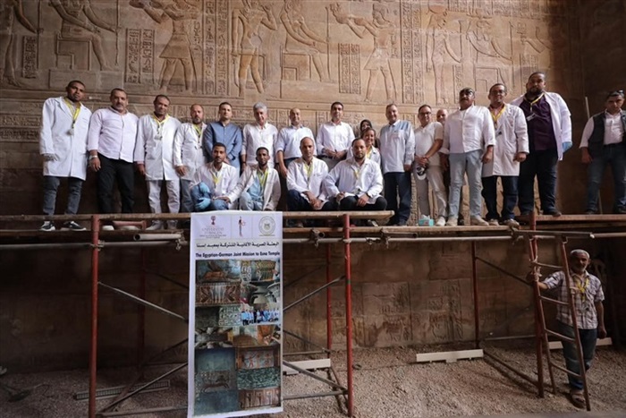 وأضاف أنه عند الانتهاء من ترميم الجدار الداخلي الجنوبي وكذلك الجزء الجنوبي من الجدار الخلفي الغربي، استطاع فريق العمل من استعادة الألوان الأصلية لهم مع الصبغات الصفراء والحمراء السائدة، الأمر الذي ساهم في الكشف عن التفاصيل المرسومة العديدة لملابس ملك وآلهة إسنا وتيجانهم وعروشهم، والتي لم تكن مرئية من قبل على الإطلاق بسبب طبقة السخام السميكة فوق النقوش البارزة، مشيراً أنه من المقرر أن تستكمل البعثة في شهر نوفمبر القادم أعمال تنظيف الجزء الخارجي من الأعمدة الستة الأمامية للمعبد.