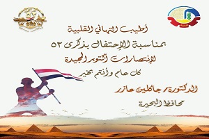 تتقدم الدكتورة جاكلين عازر، محافظ البحيرة، بخالص التهنئة لفخامة الرئيس عبد الفتاح السيسي، رئيس الجمهورية القائد الأعلى للقوات المسلحة، وأبطال القوات المسلحة البواسل، وجموع أبناء الشعب المصري ومواطنى المحافظة، بمناسبة الذكرى الثانية والخمسين لانتصارات السادس من أكتوبر المجيدة.