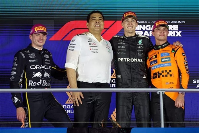 فاجأ جورج راسيل سائق مرسيدس الجميع بتصدره تأهيلات جولة سنغافورة الـ 18 من موسم 2025 لبطولة العالم للفورمولا 1 ، وليكمل فرحة فريق مرسيدس بفوزه بالسباق الختامى ليوم الأحد ، فيما وقف إلى جانب راسيل على منصة التتويج بالمركزين الثانى والثالث على التوالى .. كل من فيرستابن سائق ريد بُل ولاندو نوريس سائق ماكلارين ، وليلحق سائق ماكلارين الثانى – أوسكار بياسترى بترتيب الواصلين فى المركز الرابع ، ليؤكد بذلك عضوى فريق ماكلارين لصدارة الفريق لبطولة الصانعين ، بل وحسمها مبكراً قبل نهاية الموسم بعدد 6 جولات.