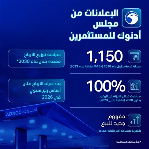 وفيما يتعلق بالعائدات، أعلنت "أدنوك للتوزيع" خلال مشاركتها في مجلس المستثمرين الذي نظمته مجموعة أدنوك، عن مقترح لتمديد سياستها الحالية لتوزيع الأرباح النقدية لعامين إضافيين وذلك حتى نهاية السنة المالية 2030 (رهناً بموافقة المساهمين النهائية في 2026) وبموجب هذا التمديد، ترتفع قيمة التزامات توزيعات الأرباح إلى 4.9 مليار دولار، بحد أدنى سنوي يبلغ 700 مليون دولار أو 75% من صافي الأرباح، أيهما أعلى، مقارنةً بالتزام سابق قدره 3.5 مليار دولار من عام 2024 حتى نهاية عام 2028. ومن المقرر أن تدخل السياسة الجديدة حيز التنفيذ اعتبارًا من الربع الأول لعام 2026، حيث سيتم توزيع الأرباح على أساس ربع سنوي.