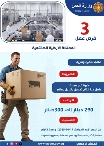 وأوضحت هبة أحمد، مدير عام الإدارة العامة للتشغيل بالوزارة، أن الوظائف المتاحة على مهنة عامل تحميل وتنزيل، وتشترط الخبرة في مهنة عامل خط إنتاج تحميل وتنزيل بضائع، مشيرة إلى أن الراتب يتراوح بين 290 إلى 300 دينار أردني شهريًا.