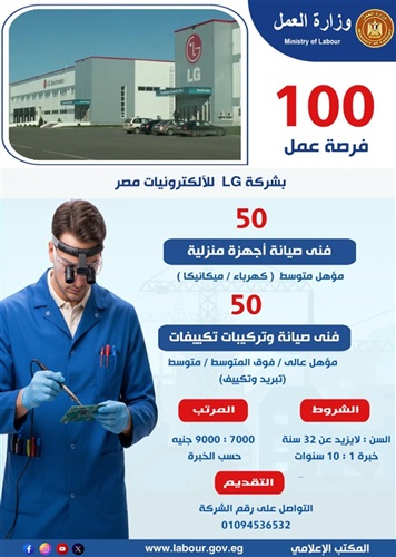 وزارة العمل: 100 فرصة عمل جديدة بشركة LG للإلكترونيات مصر