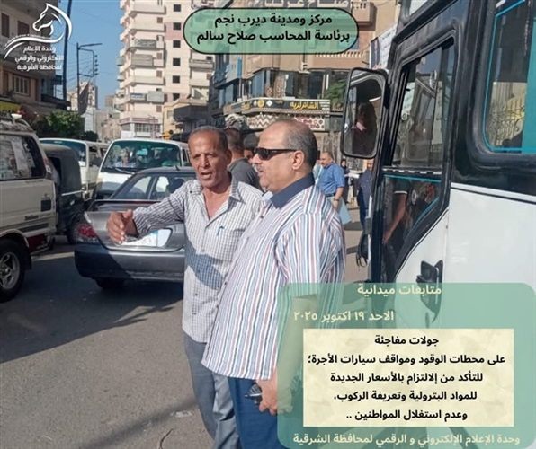 تنفيذاً لتوجيهات المهندس حازم الأشموني محافظ الشرقية، لرؤساء المراكز والمدن والأحياء، بتكثيف التواجد بمواقف سيارات الأجرة، للإستفسار من الركاب عن قيمة الأجرة قبل خروج السيارات، للإطمئنان على الإلتزام بالأسعار المعلنة،وذلك عقب تحريك أسعار المواد البترولية.