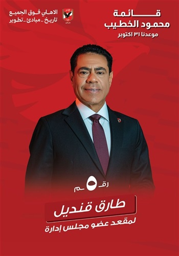 كشف طارق قنديل، عضو مجلس إدارة النادي الأهلي ومدير عام بالمصرف العربي الدولي AIB، عن ترشحه لعضوية مجلس إدارة النادي ضمن قائمة الكابتن محمود الخطيب في انتخابات الأهلي المقرر عقدها يوم 31 أكتوبر 2025، تحت شعار «تكملة المشوار.. تنمية واستثمار».