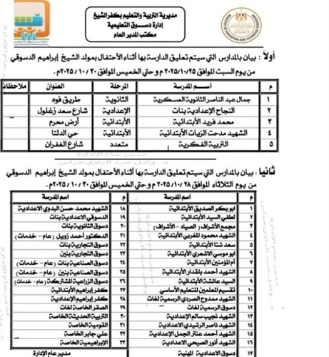 بالأسماء.. تعطيل الدراسة في 38 مدرسة بدسوق خلال احتفالات مولد إبراهيم الدسوقي حفاظًا علي سلامة الطلاب