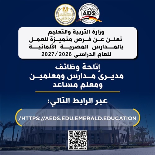 وزارة التعليم تعلن عن فرص متميزة للعمل بالمدارس المصرية الألمانية للعام الدراسى 2026 / 2027