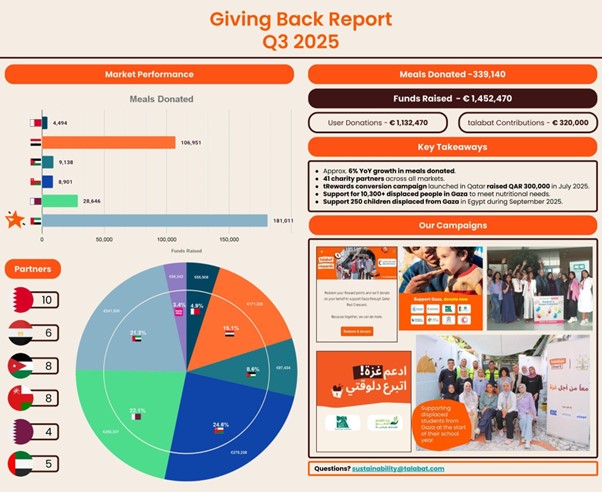 ومن خلال برنامج طلبات للعطاء، (Giving Back)، تُحوّل الشركة اللحظات اليومية العادية إلى فرص للعطاء ودعم الآخرين، إذ تُتيح للعملاء القيام بالمساهمات الخيرية بسهولة من خلال التطبيق نفسه، لتتحول "طلبات" تدريجياً وتصبح واحدة من أكبر المنصات الرقمية المُخصصة لجمع التبرعات الخيرية في المنطقة، لتُجسد بذلك مثالاً حقيقياً واضحاً لمفهوم توظيف للتكنولوجيا من أجل دعم الأعمال الخيرية. وخلال الربع الثالث فقط من عام 2025، ساهم مستخدمو "طلبات" في التبرع بأكثر من 330 ألف وجبة طعام عبر ثمانية أسواق تعمل بها، وتم جمع 1.4 مليون يورو (نحو 6 ملايين درهم إماراتي) من خلال التبرعات والمساهمات الخيرية عبر التطبيق، إلى جانب دعم 41 مؤسسة خيرية عبر مجموعة واسعة من المبادرات الإنسانية.