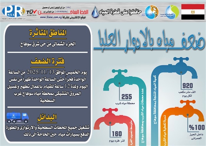 اعلنت شركة مياه الشرب والصرف الصحى بسوهاج عن ضعف المياه بالادوار العليا بالمنطقة الشمالية بحى شرق سوهاج وذلك يوم الخميس الموافق 13 نوفمبر 2025 فى تمام الواحدة فجراً وحتى الواحدة ظهراً من نفس اليوم ولمدة 12 ساعة