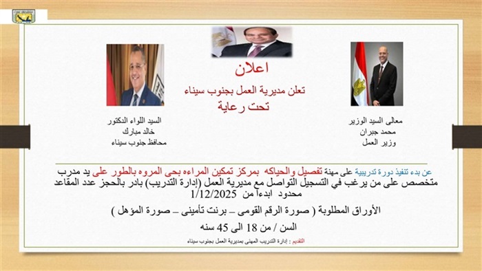وتواصل مديرية العمل بجنوب سيناء جهودها في تقديم خدمات تدريب وتأهيل مجانية بما يعزز التنمية المجتمعية ويدعم خطط الدولة في توفير فرص عمل حقيقية للمواطنين