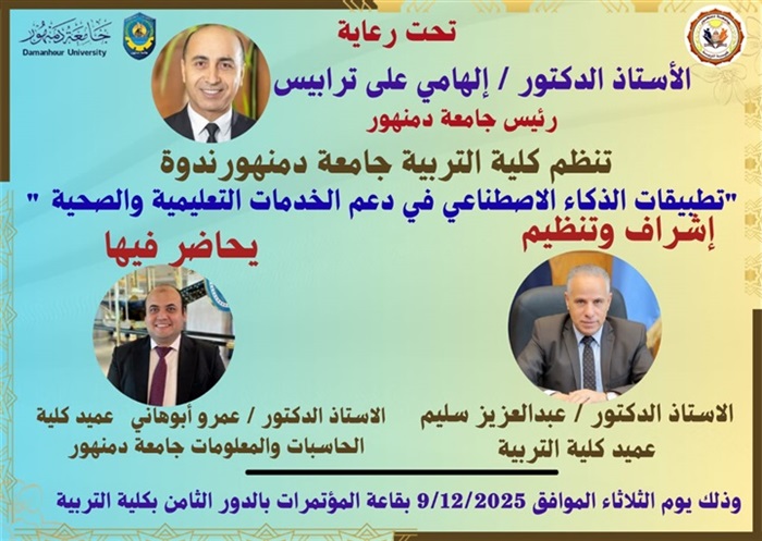 تستعد كلية التربية بجامعة دمنهور لتنظيم ندوة رائدة تحت عنوان: "تطبيقات الذكاء الاصطناعي في دعم الخدمات التعليمية والصحية"، وذلك يوم الثلاثاء 9 ديسمبر 2025، بقاعة المؤتمرات بكلية التربية،